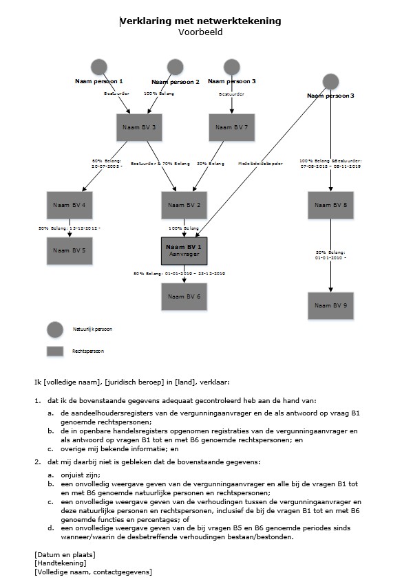 | Voorbeeld netwerktekening (zie hieronder) | De voorbeeld netwerktekening geeft weer hoe wij getekend willen zien: De netwerktekening is opgemaakt mét een verklaring, afgegeven door een accountant, advocaat, notaris, kandidaat-notaris of een hiermee vergelijkbare onafhankelijke beoefenaar van een juridisch beroep. |