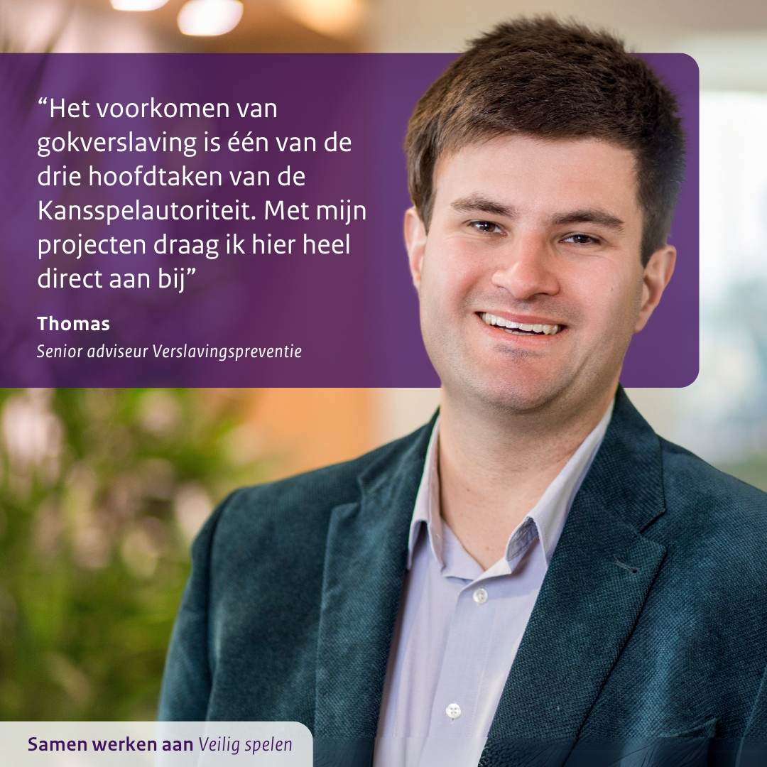 Thomas Borghols is sinds oktober 2022 in dienst bij de Kansspelautoriteit en werkt als senior adviseur verslavingspreventie in het team Strategie van de afdeling Communicatie & Strategie. In zijn werk heeft hij veel te maken met de spelers van kansspelen.